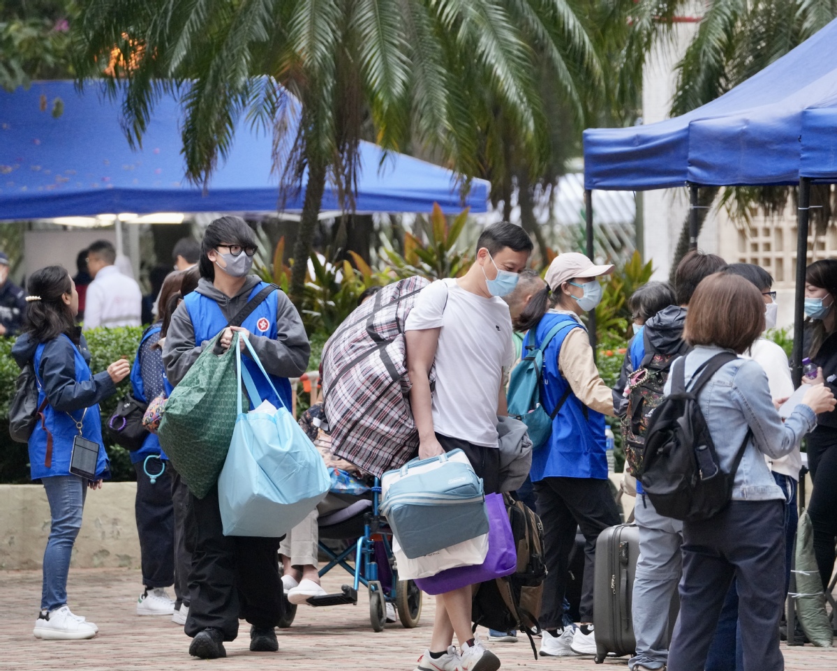 Служители от правителствения отдел за бързо реагиране помагат на жителите на Wang Chi House да пренесат личните си вещи в Тай По, Хонг Конг, 3 декември 2025 г. [Photo by ADAM LAM / CHINA DAILY]