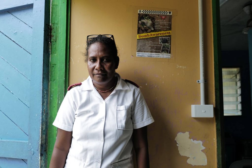 Жена стои до плакат, предупреждаващ жителите да внимават с неексплодирали боеприпаси на Соломоновите острови. Снимка: Тихоокеански офис на ПРООН/Кристофър ТийсдейлЖена стои до плакат, предупреждаващ жителите да внимават с неексплодирали боеприпаси на Соломоновите острови. Снимка: Тихоокеански офис на ПРООН/Кристофър Тийсдейл