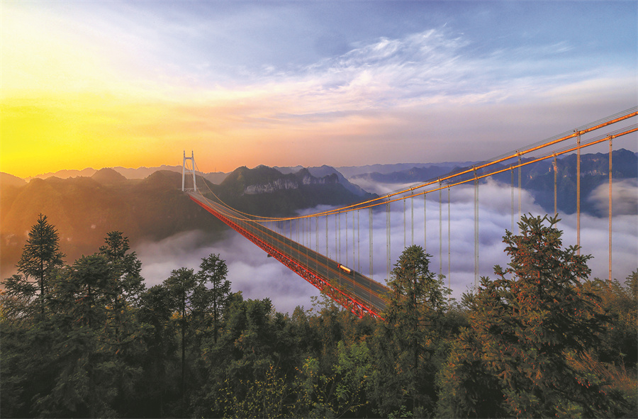 Мостът Aizhai, който обхваща Големия каньон Dehang, е основна атракция в автономните префектури Xiangxi Tujia и Miao, провинция Хунан. [Photo provided to China Daily]