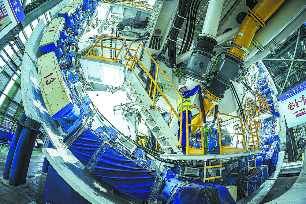Работник инспектира машина за тунелиране на щит във вторник, след като машината за щит с диаметър 14 метра, разработена от China Railway Construction Corporation, слезе от производствената линия в Нантонг, провинция Дзянсу. ЛИУ ЦЗЯ/СИНХУА