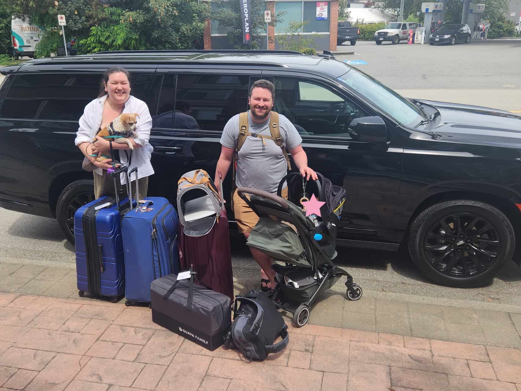 Riana, Colin, Baby C and their dog Ellie in front of a car with all of their bags headed to the airport