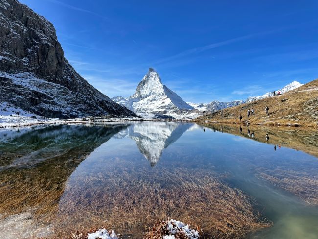 The iconic Riffelsee is an alpine lake at 2757m, world-famous for its perfect reflection of the Matterhorn peak on calm days. The best times for photographers to capture this beautiful scene is in the early morning or late afternoon.
