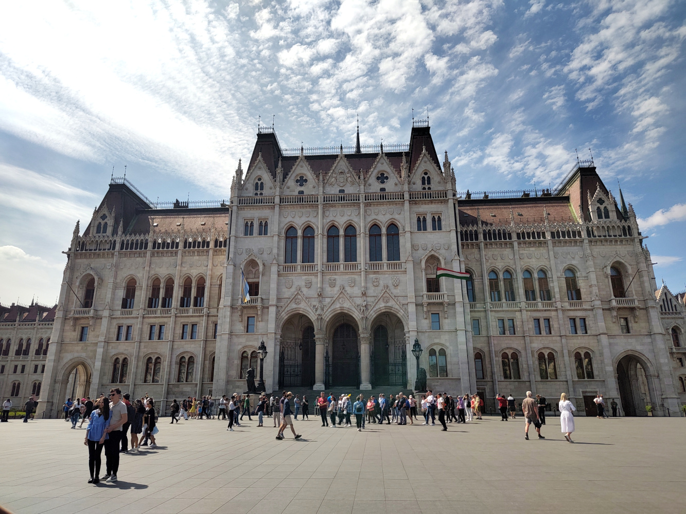 The façade you see here is the main entrance facing Kossuth Lajos Square, often called the “front” of the Parliament – the side used for official ceremonies and the Changing of the Guard.
