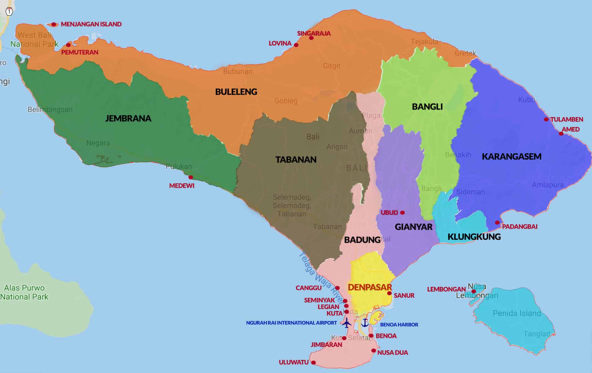 Bali Tourist Hotspots. The red-labeled places are the popular tourist areas in Bali.